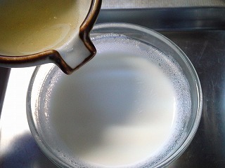 3.温めた牛乳(1カップ)に水(大さじ2)でふやかしたゼラチン 1袋(5g)を加えて充分に溶かします。