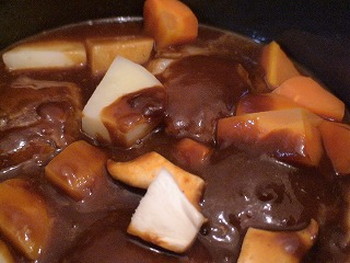 5.3のフライパンに4のデミソースを加え、マッシュルーム(エリンギ代用)、にんじん、じゃがいも、ローリエを加え、フタをし、弱火で約10分煮込む。(写真:ローリエ入ってません)