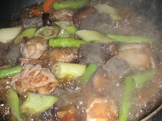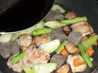 5.鶏肉の色が変わったらこんにゃく、干ししいたけを加え炒めます。