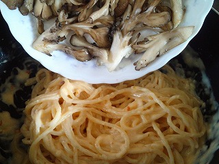 6.4のホワイトソースに湯であげたパスタ、5のまいたけのソテーを加え混ぜ合わせます。