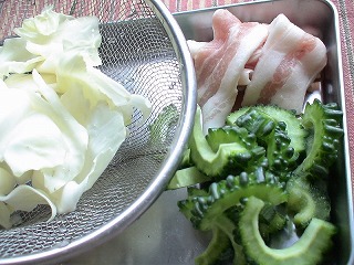 3.フライパンにサラダ油を足し、豚肉、キャベツ、もやし、ゴーヤを炒め顆粒ガラスープを加えます。
