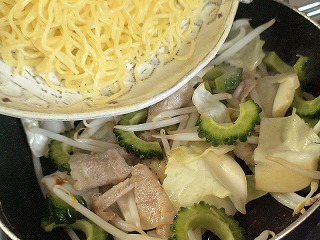 4.2の炒めた麺を加え塩・こしょう・顆粒ガラスープ(各少々)で味を調えたら【ゴーヤの塩焼きそば】の完成