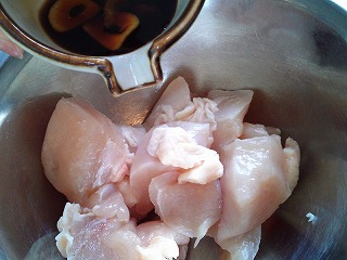 2.鶏肉をひと口大の大きさに切って、1の香味じょうゆ(大2)をからめて5分ほどおきます。