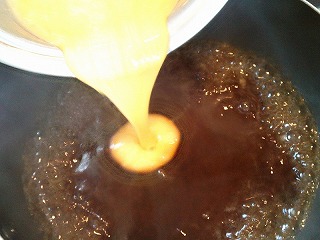 トロミがついたら、よく溶いた卵を入れ軽くかき混ぜます。
