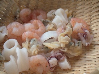 2.シーフードミックス(冷凍200g)を沸騰したお湯に通し、ザルに上げ、軽く塩を振っておきます(大きい場合は、食べやすい大きさに切る)。