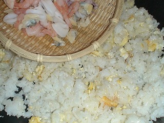 5.2のシーフードミックス・塩・コショウ(白)・うま味調味料(各少々)を加え炒めます。