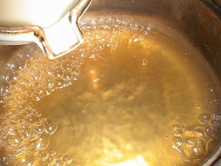 もう一度火にかけ、スープに塩(小さじ1)、酒(大さじ4)、コショウ(白 少々)を加え、その都度沸かし、濃口醤油・砂糖(各大さじ1)を加えます。