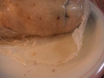 9.7の蒸し上がった鶏肉の粗熱がとれたら、皿に上でラップを取り外します(写真右)。