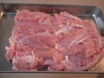 1.鶏もも肉の筋や脂の部分を取り除き、足先側に切り目を入れる(写真:右側が足先です)。