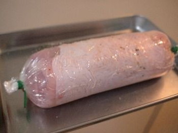 6.ラップを広げて、その上に5の鶏肉を足先を手前にしておきます(写真下左)。手前に4の野菜をならべて、太巻きの要領でラップを巻いて鶏肉をロールに巻きます。両端を輪ゴムで結びます(写真下右)。