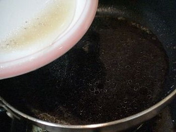 12.フライパンにタレ、9の蒸した時に出た肉汁を加え入れて煮詰めます(写真右)。