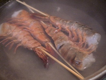 2.酒と塩をいれた湯が沸騰したら、氷を入れて火を止め、そこにエビを加えます。そのまま自然に冷まします。