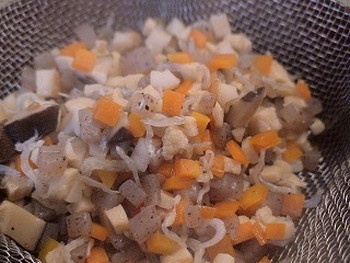 2.コンニャク・ニンジン・ちくわも、粗めのみじん切りにします。レンコンは、薄切り(大きければ半月切り)にします。