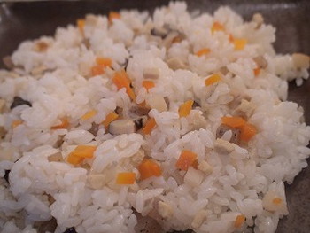 1.すし飯のさらしを取り、五目を加え、しゃもじで切るように混ぜます。(写真右)