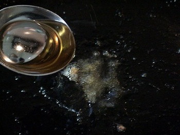8.7へ黒酢(写真右)、ポートワインを入れ、鍋底を洗うように煮詰め、器に取り出す。(半量になるくらいまで煮詰めるとのこと)
