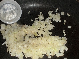 3.フライパンに油をひき、2の玉ネギを炒め、塩(ひとつまみ)を加え、しんなりするまで炒める。