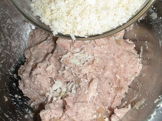 ※塩を入れてよく練ることで、肉のつながりがよくなる。 また、氷水を加えて練ると、やわらかくなり、つながりも良くなる。