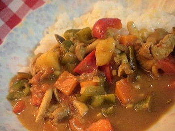本来、ナス&ほうれん草も加わるレシピですが、ほか材料がウチにあるのでピーマン(緑&赤)で、早速、作っちゃいました。カレー粉とクミン・チリパウダーだけでも十分に美味しく、野菜たっぷり、豚肉も入ってるので大満足でした!