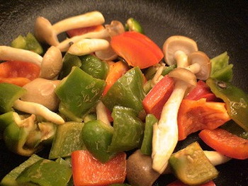 6.フライパンにサラダ油を多めに入れ熱し、ナス、シメジを強火で炒める。ナスの表面を箸で押した時に、軽くへこむ程度まで炒まったら、キッチンペーパーなどで余分な油を切り、塩、コショウで下味をつけておく。