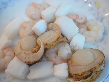 1.鍋に湯を沸かし、沸騰したら酒(適量)を入れて、シーフードミックスを湯通し再沸騰したら、氷水に入れ洗いながら粗熱を取る。さらにザルにあげて、塩(適量)をふっておく(写真右)。