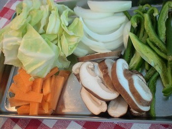 2.タマネギ、しいたけは薄切り、ニンジンは皮をむき4cm長さの短冊切り、ピーマンはヘタ・種を取り除き細切り、キャベツは食べやすい大きさにざく切りします(写真右)。