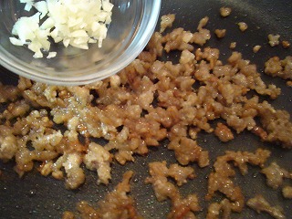 3.鍋に油(大2)を入れ、火をつけ油が冷たいうちにひき肉(100g)を入れ、ほぐしながら、香ばしさがでるまでじっくりと炒めます。出てきた油は丁寧に拭き取ります。