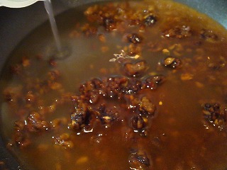 そこに、酒(大1)を入れ、スープ(200cc)を加え沸かします。沸いたら、濃口しょう油(小2)・砂糖(小1)を加えます。