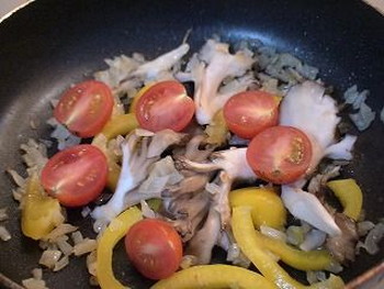 2.タマネギが透き通ってきたら、パプリカ、舞茸を入れて炒め、さらにミニトマト、ほうれん草を加えて炒めます。