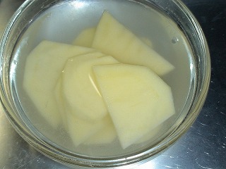 1.じゃがいもは、皮をむいて薄くスライスします(大きいものは半分に切ってから行う)。
