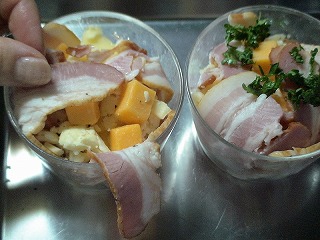2.耐熱のマフィン型へ十文字にベーコンを敷き、1のじゃがいも、2種のチーズ(ピザ用・チェダー)を交互に重ねて層にします。