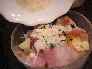 最後にベーコンでふたをして、塩・こしょう、パセリを散らします。