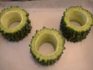 要は、「ゴーヤの肉詰め」。早速、作ってみたら、おもてなしにもなるような、かわいい仕上がりでいい!!