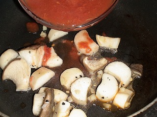香りが出たら、中火にし、トマト水煮、水、オレガノ(手でちぎる)、塩・こしょうを加えトロリとするまで煮詰めます。