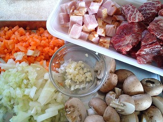 ●私は、塊りの牛肉を。マッシュルームはブラウンのみ使用。小さいため丸ごと(もしくは2等分)。