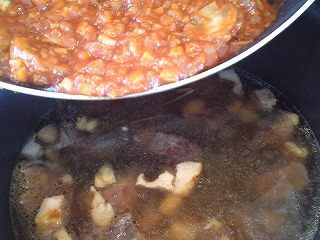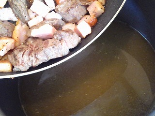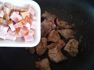 4.炒めて出た脂を除いて3の牛肉、ベーコンを2の鍋に移します(フライパンは、そのままで)。