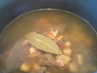 ローリエを加え沸騰するまで強火、アクを取り弱火で煮ます。
