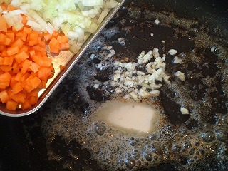 5.4のフライパンにバターを加え、ニンニク、タマネギ、ニンジンを炒め、塩・コショウ、バ