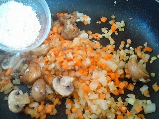 しんなりしたら、小麦粉を加えて粉気がなくなるまで炒めます。
