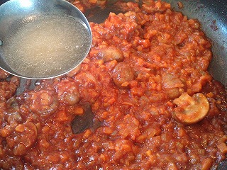 さらにトマトピューレ、赤ワインを加えて炒めます。