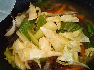 4.フライパンにごま油を足して牛肉を炒め、2の野菜を加え、塩・こしょう、中華だしを加えて炒めます。