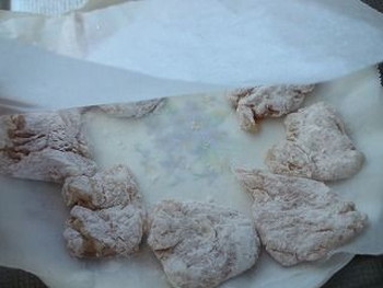 2.1をボウルに入れて、(A)の下味を加え揉み込み、さらに片栗粉、強力粉を加えてよくまぶします