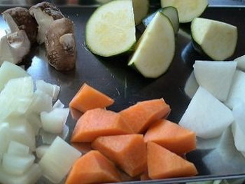 5.タマネギは2cm角に、シイタケは石づきを除き(十字に)4等分に切ります。ピーマンはヘタ・種を除き乱切りにします(ズッキーニを代用しました)。