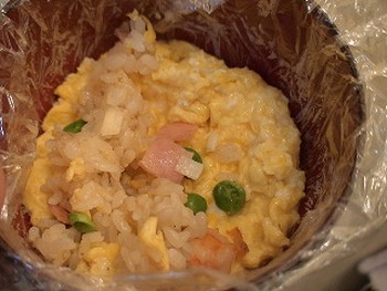 ※深皿(コップ)にラップを敷き、卵、チャーハンの順に詰めて盛り付ける方法も!(写真右:詰め途中ですが)