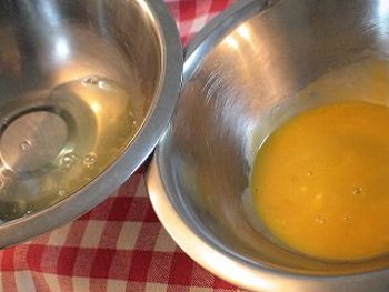 3.ボウルに卵(2個)を卵黄と卵白、別々に分け入れる。卵黄は、なめらかに溶きほぐしておきます。