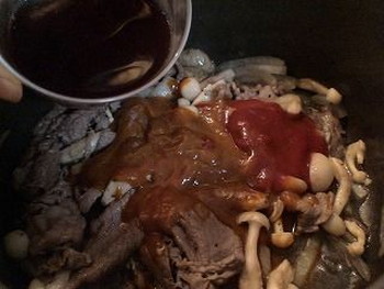 2.牛肉に火が通り、野菜がしんなりしたら、デミグラスソース、赤ワイン(80~100ccくらいのようでした)、ケチャップ(おたま1杯くらいでした)、ウスターソースを加えて塩・コショウで味をととのえます。