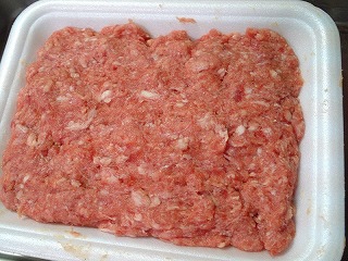 2.1の肉を食品トレーに入れて(15cmX20cm目安)、平らに広げてかるく押しつけます。
