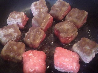 上の写真、どうでしょう?千秋さんの「四角い肉団子!」のコメント通り、あくまで「ステーキ風」ですが、塩・こしょうが効いてて、思った以上に美味しくてビックリです!!