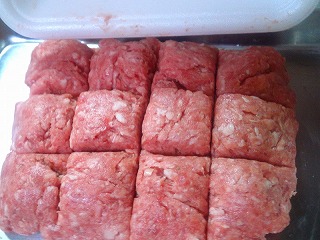 2.1の肉を食品トレーに入れて(15cmX20cm目安)、平らに広げてかるく押しつけます。