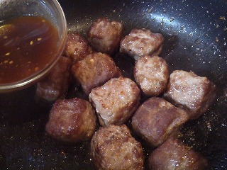 5.4のフライパンに3のサイコロステーキを戻し入れて、焼き肉のタレを加えて絡めます。