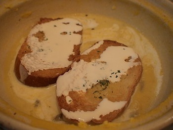 1.土鍋を火にかけて、ガーリックトーストを入れて、生クリームをかける(写真右)